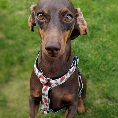 El arnés en H Max & Molly Watermelon posee una estructura de doble capa de neopreno extra suave y de secado rápido y de poliéster. Este divertido arnés para perros es ajustable en cuatro posiciones, por lo que se puede adaptar al tamaño del perro. Tiene cierres superfuertes y estables y dos anillas semicirculares y un ojal para colgar accesorios.
