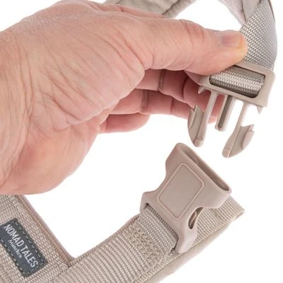 La hebilla fácil de usar ayuda a poner y quitar el arnés Nomad Tales Blush beis topo de forma rápida y fácil. Si se ensucia después de una divertida aventura, basta con limpiarlo en la lavadora. Su diseño de colores neutros, asà como el bonito colgante y el parche con el texto «Nomad Tales», completan el arnés para convertirlo en un compañero único.