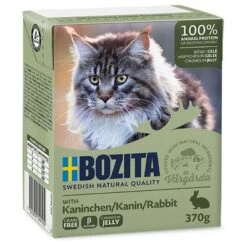 Bozita trocitos en gelatina viene en prácticos ecológicos Tetra Recart, este envasado garantiza una protección óptima del contenido, es fácil de abrir y cerrar. De esa manera se puede conservar el alimento hasta dos días en la nevera. Los envases vacíos pueden ser reciclados en el contenedor de reciclaje. El envase vacío se puede aplanar para que ocupe poco espacio en el contenedor de residuos plásticos: una contribución importante al medio ambiente.