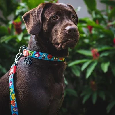 Correa para perros, multiples ajustes, con anillas semicirculares y mosquetones robustos, resistente estructura de doble capa con acolchado, de neopreno y poliéster. Diseño monstruos de colores.
