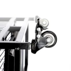 Jaula para perros de máximo 50 kg, para uso en interior, 4 ruedas giratorias, puerta frontal, techo abatible, bandeja inferior extraíble, rejilla de acero, de metal y plástico