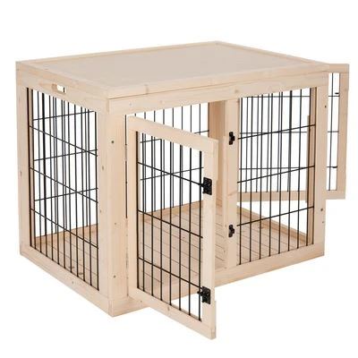 Jaula para alojar perros provisionalmente y seguros, color madera natural, dos entradas, robustas puertas de reja con cierres metálicos, suelo extraÃble, techo robusto, de madera con reja de hierro