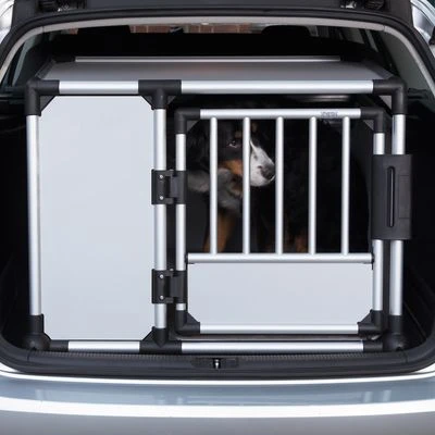 Jaula grande de transporte para perros; robusta y ligera, pues está fabricada con aluminio. Las puertas anterior y posterior oblicuas ahorran espacio en el maletero. Con alfombrilla térmica.