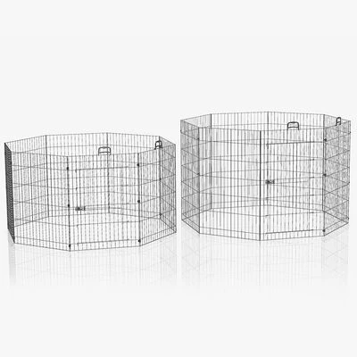 Parque plegable de acero con 8 piezas individuales que se pueden montar según necesidad. Para animales pequeños. Con puerta integrada y asas de plástico extraÃbles. Color negro.