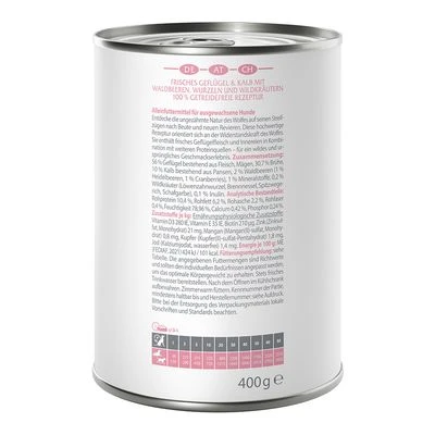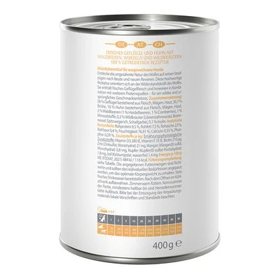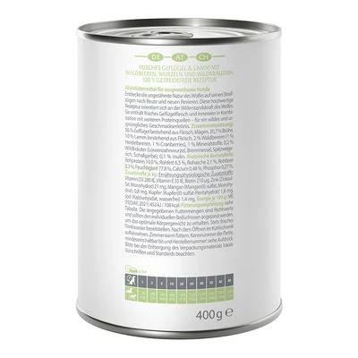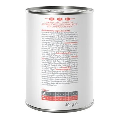 Comida húmeda para perros con receta 100 % sin cereales y con bayas, raÃces y hierbas silvestres, contribuye a la digestión y es perfecta para perros que sufren intolerancia o alergia a los cereales.
